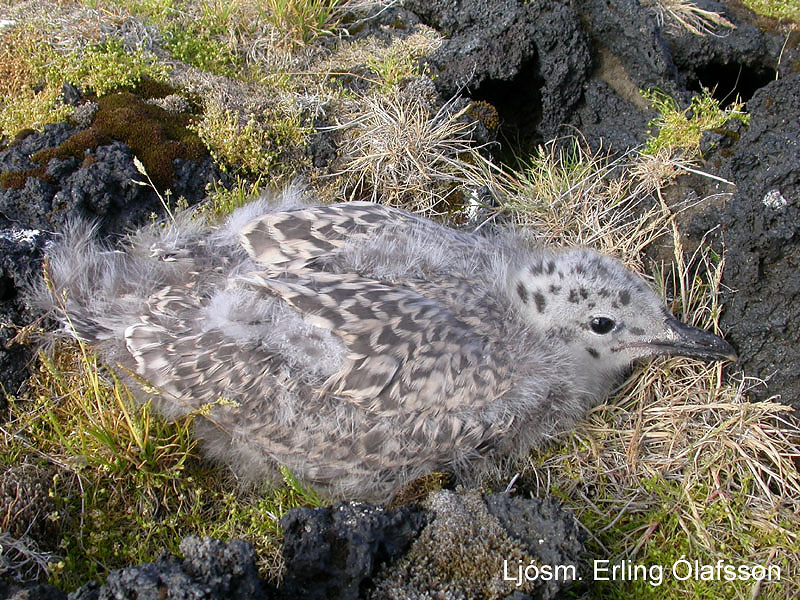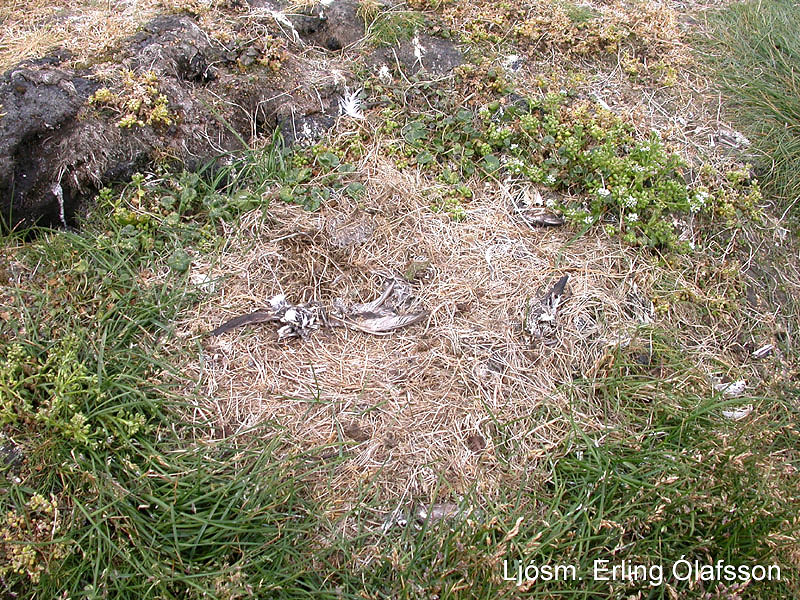 Greinilegt var að varp máfa hefur gengið illa að þessu sinni og fáir ungar að komast á legg. Sílamáfur, sem hefur verið algengasti máfurinn undanfarin ár, var óvenju fáliðaður að þessu sinni. Hann hefur þó orpið í nokkrum mæli í vor en afkoma unga verið afleit. Silfurmáfur hefur haldið í horfinu, en mun meira var af svartbak en undanfarin ár. Svartbaksungar voru í miklum meirihluta. Áætlað er að alls 150 – 200 pör af ofangreindum máfategundum hafi haldið sig í eynni í sumar. Par hvítmáfs og silfurmáfs fannst með unga. Allmikið var um ritu (um 200 fuglar) í suðurbjarginu en mun minna í móberginu vestan megin. Varp ritu virðist einnig hafa misfarist því aðeins fáeinar ritur sátu á hreiðrum. Í bjarginu voru einnig teistur og nokkrir lundar sáust þar, en lundi hefur verið að taka heima í Surtsey á undanförnum árum. Fýlar voru með egg og unga á bjargbrúnum og gígunum inni á eynni; alls voru talin 125 hreiður. Ein álka sást á sjó undir bjarginu og þótti atferli hennar benda til varps. Ekki er vitað til að álka hafi verpt í Surtsey, en það mun koma í ljós á næstu árum hvort hún er nýr varpfugl. Af landfuglum hafa nokkur pör af sólskríkjum orpið í eynni í sumar. Þar var einnig maríuerlupar og þúfutittlingspar með unga. Jafnframt sáust tveir steindeplar, en þeir voru augljóslega gestkomandi. Ekki sást grágæs að þessu sinni en mikill skítur var eftir gæsir í máfabyggðinni. Grágæs hefur orpið í Surtsey undanfarin ár. Leiðangursmenn fundu rytjur af haftyrðlum svo hundruðum skipti í máfabyggðinni, stundum nokkrar saman í hreiðurskálum máfanna (mynd). Haftyrðlar, sem eru minnstir svartfugla, verpa á heimskautasvæðum fyrir norðan Ísland. Á veturna eru þeir algengir á sjó hér við land.