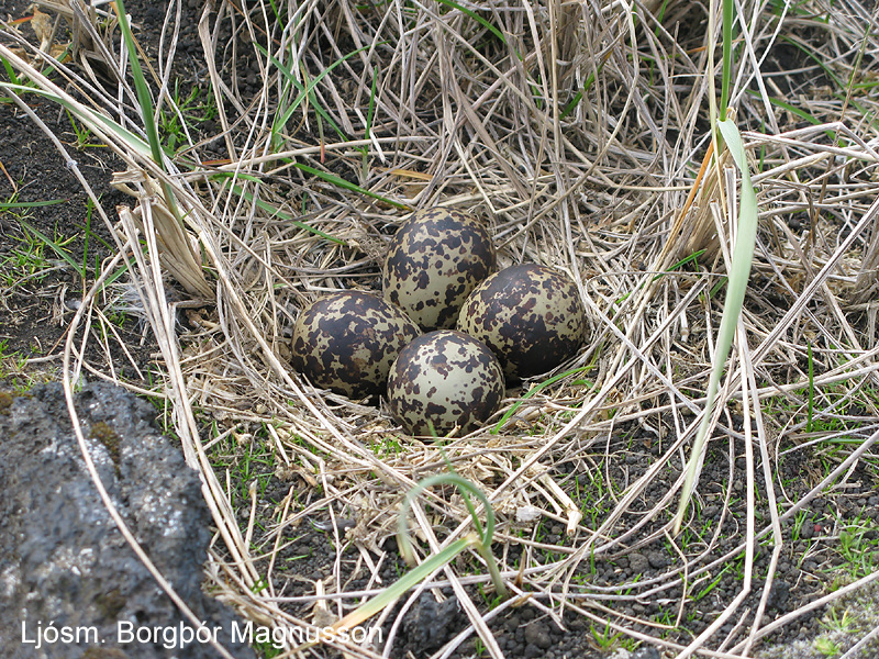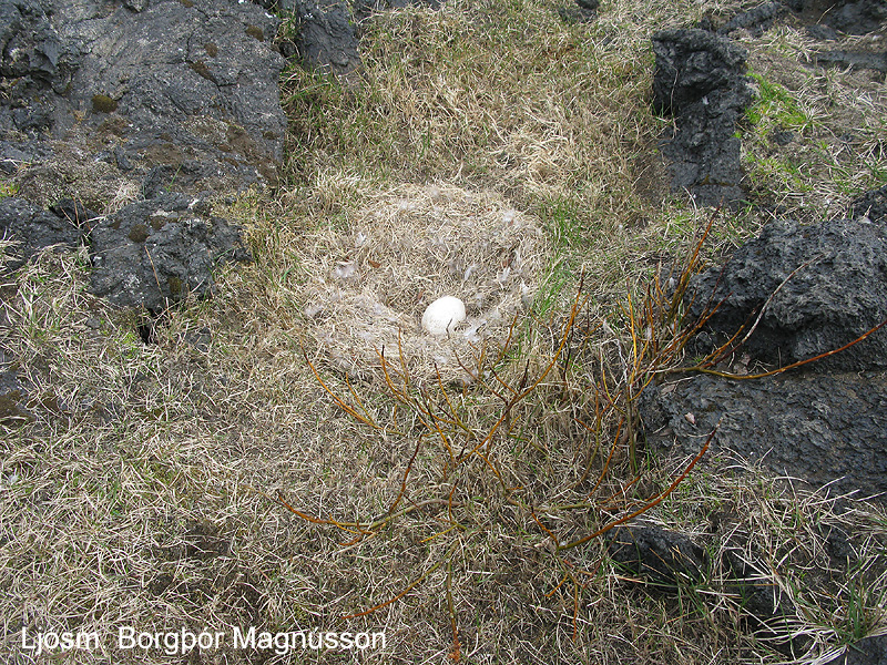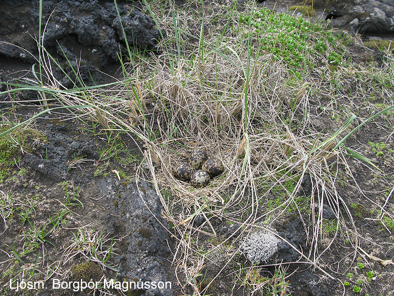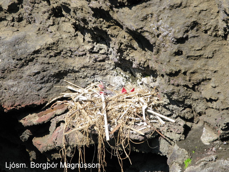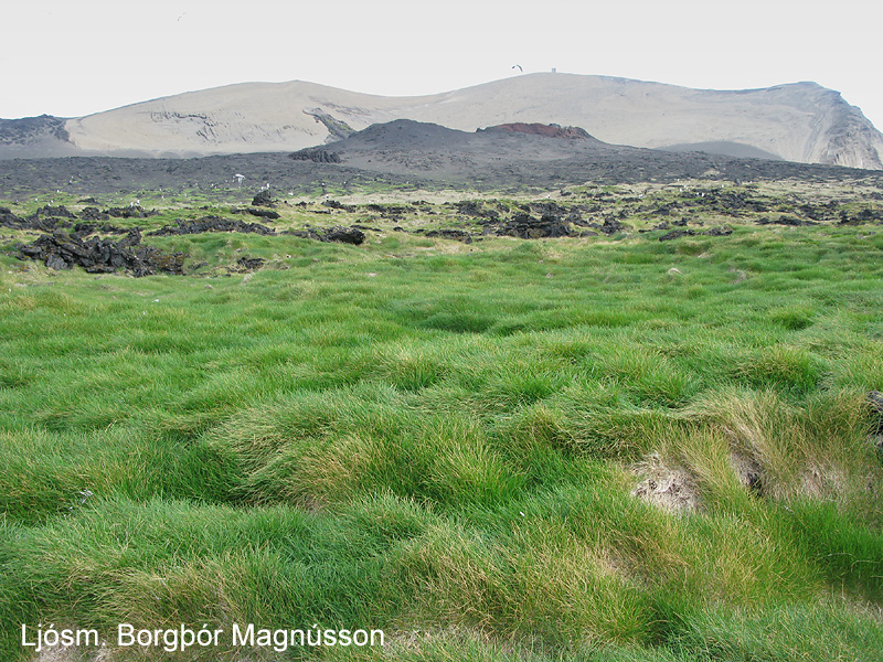 | Svangir hrafnsungar í laup í hraungíg í Surtsey. Byggingarefni er einkum rótarrenglur fjöruarfa og merkihælar sem krummi hefur stolið frá rannsóknamönnum. Ljósm. Borgþór Magnússon. | Gróskuleg túnvingulsbreiða í máfavarpinu í Surtsey. Ljósm. Borgþór Magnússon. |