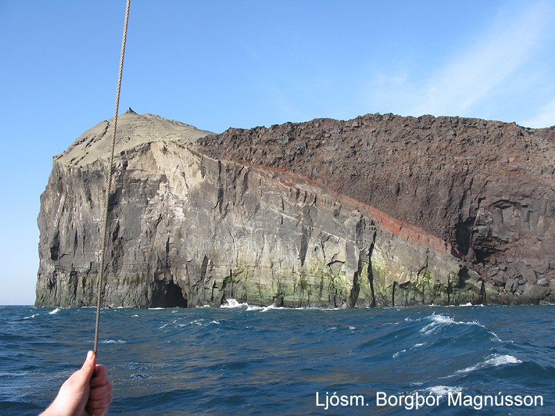 | Veðurstöðin risin á hrauninu í Surtsey. Leiðangursmenn frá vinsti: Ingvar Atli Sigurðsson, Náttúrustofu Suðurlands; Sigvaldi Árnason, Veðurstofu Íslands; Bjarni Diðrik Sigurðsson, Landbúnaðarháskóla Íslands og Borgþór Magnússon, Náttúrufræðistofnun Íslands. Ljósm. Borgþór Magnússon. | Móbergsklettar og hraun í sjávarhömrum á vesturhluta Surtseyjar. Ljósm. Borgþór Magnússon. |