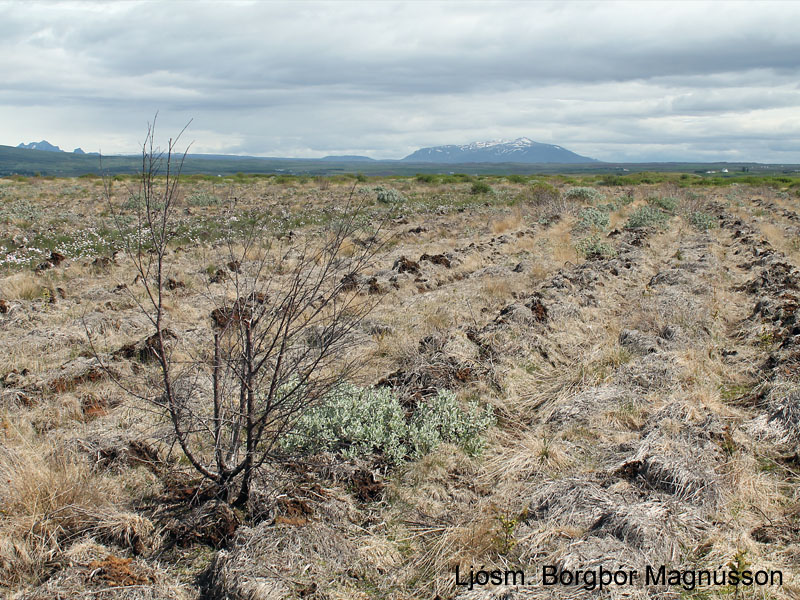 Land við Dagmálatjörn sem tekið hefur verið til skógræktar. Kjarr- og mýrlendisgróðri hefur verið eytt með plöntueitri og sitkagreni plantað í landið. Dauð birkihrísla er í forgrunni en loðvíðirinn hefur það betra. Ljósm. Borgþór Magnússon, 2. júlí 2013.