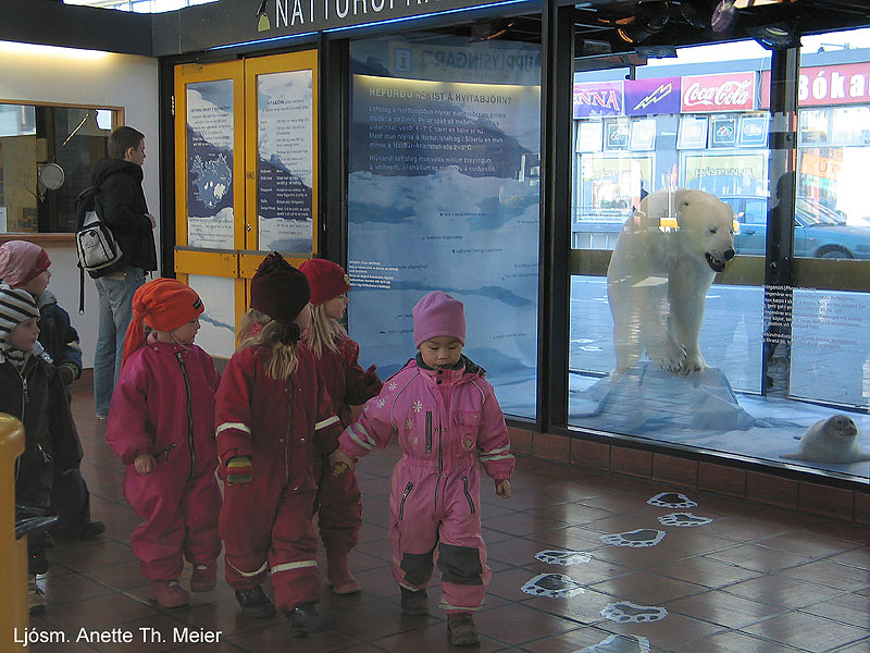 | Börnin horfðu agndofa á hvítabjörninn.Ljósm. Anette Meier. | Frá opnuninni: Fríða Ólafsdóttir, Magnús Jóhannesson, Jón Gunnar Ottósson og Páll Reynisson. Ljósm. Erling Ólafsson. |