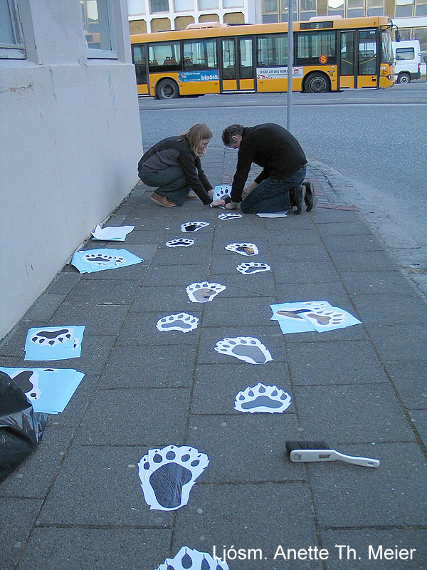 | Hvítabjörninn vekur mikla athygli vegfarenda á Laugaveginum og hér má sjá hjólreiðamann virða hann fyrir sér á Safnanótt. Ljósm. Erling Ólafsson. | „Spor“ eftir hvítabjörn leiddu menn frá biðstöðinni á Hlemmi í Möguleikhúsið og í sýningarsali NÍ. Ljósm. Erling Ólafsson. |
