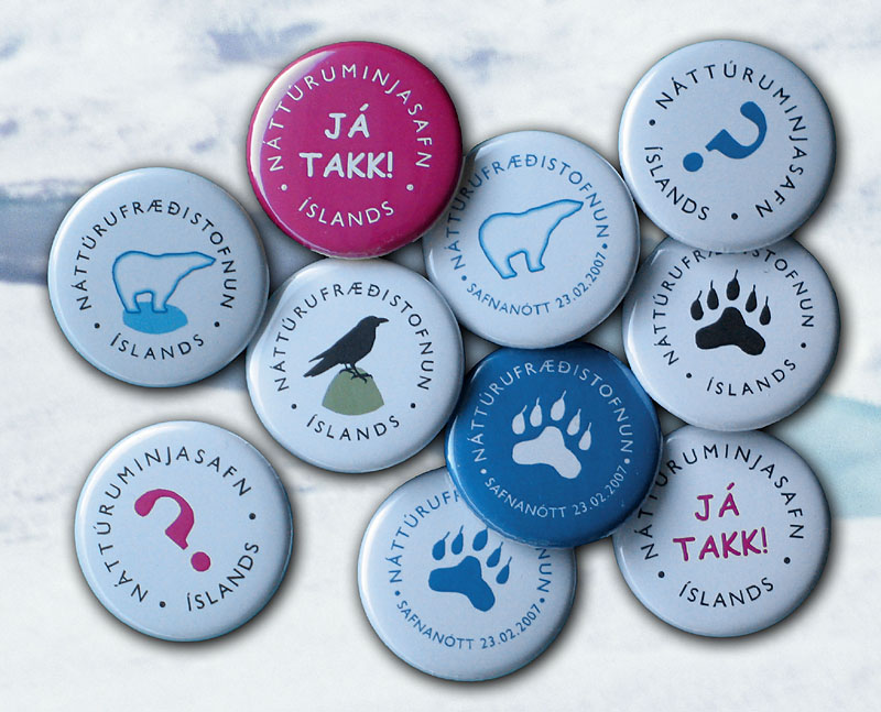 | Stundvíslega klukkan sjö á safnanótt var umbúðapappírinn tekin af búrinu á Hlemmi. Ljósm. Anette Meier. | Sýnishorn af barmmerkjum sem NÍ gaf út á Safnanótt. Ljósm. Anette Meier. |