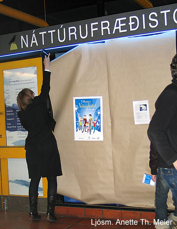 Á milli sex og sjöhundruð manns komu gagngert á Hlemm á Safnanótt, gæddu sér á íspinnum og kynntu sér það fræðsluefni sem á boðstólum var. Það var Magnús Jóhannesson ráðuneytisstjóri umhverfisráðuneytis sem opnaði formlega örsýningu NÍ á Hlemmi um hvítabirni á Íslandi og loftslagsbreytingar. Meðal gesta voru hjónin Páll Reynisson og Fríða Ólafsdóttir eigendur Veiðisafnsins á Stokkseyri en þau lánuðu NÍ hvítabjörninn.
