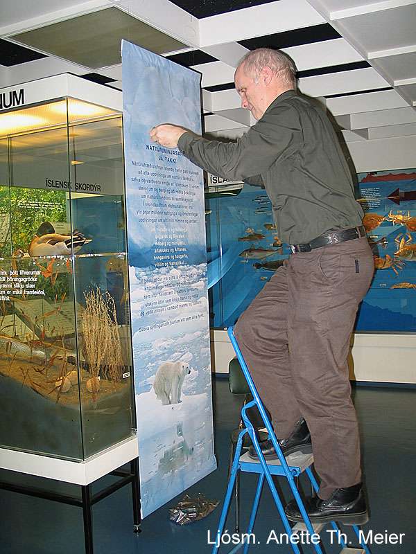 | Ágúst Ú. Sigurðsson gengur frá upplýsingaborða um Náttúrufræðistofnun í sýningarsal. Ljósm. Anette Meier. |
