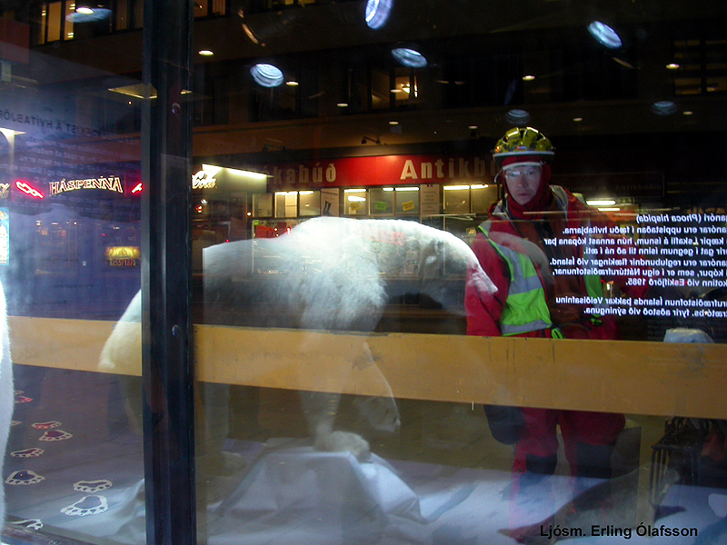 Þorvaldur Þ. Björnsson hamskeri NÍ kemur hvítabirninum fyrir á Hlemmi. Ljósm. Erling Ólafsson