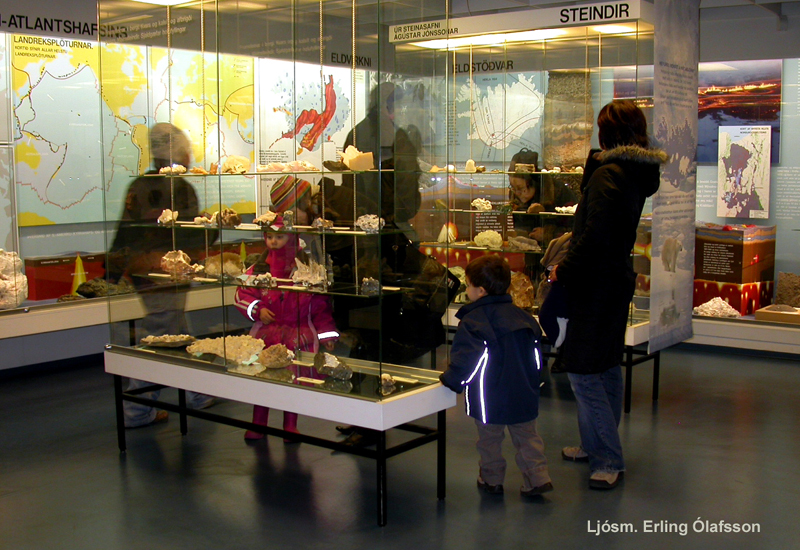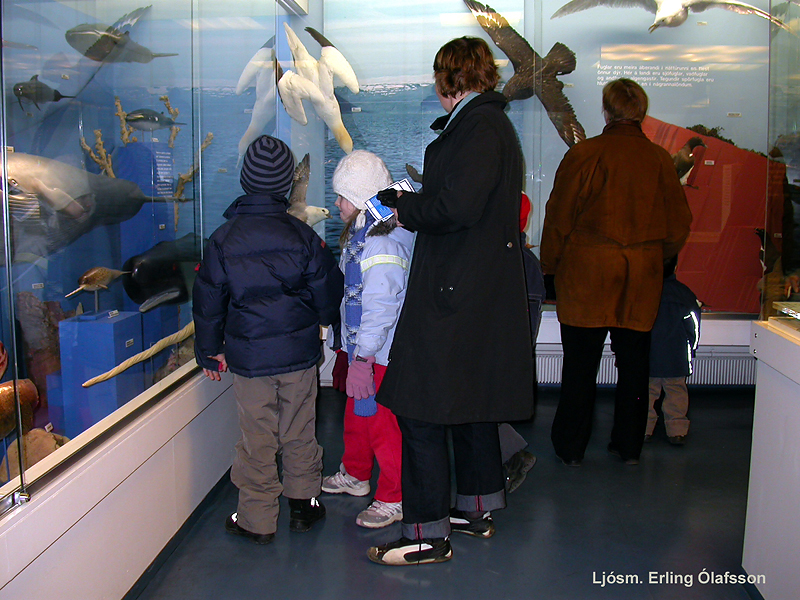 | Það var einkum fjölskyldufólk með börn sem heimsótti sýningarsali NÍ við Hlemm. Hér má sjá gesti virða steinasýninguna fyrir sér.Ljósm. Erling Ólafsson. | Líkön af hvölum og náhvalstönn vöktu einnig athygli krakkanna.Ljósm. Erling Ólafsson. |