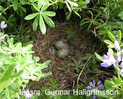 Sílamáfshreiður í lúpínubreiðu. Ljósm. Gunnar Hallgrímsson.