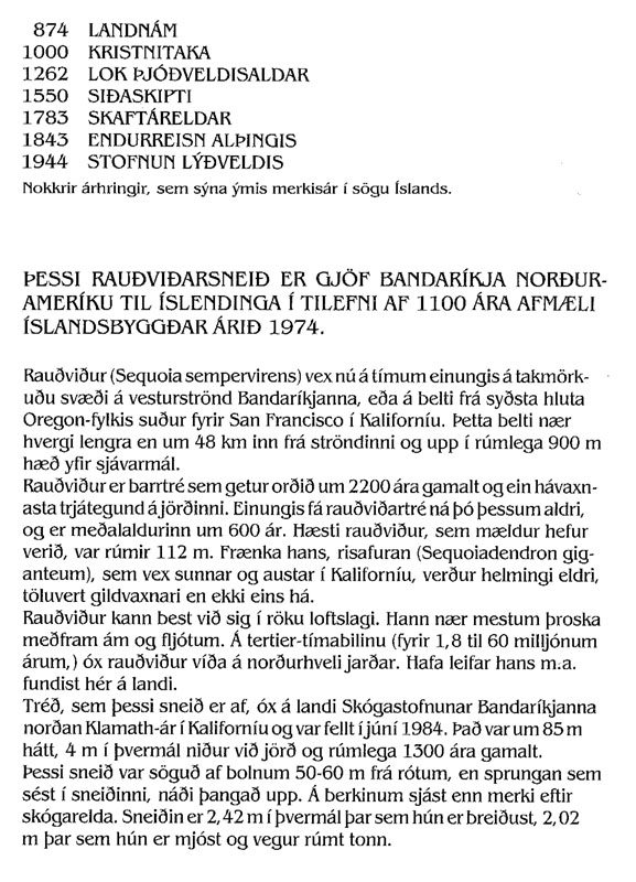 Á afmæli 1100 ára byggðar á Íslandi árið 1974 tilkynnti Roger Morton fulltrúi Bandaríkjanna að ríkisstjórn sín myndi gefa Íslandi sneið af risafuru (Sequoiadendron giganteum) sem hluta af afmælisgjöf. Hugmyndin að þessari þjóðargjöf átti rætur að rekja til þess að nokkru áður hafði Náttúrufræðistofnun Íslands beðið sendiráð landsins í Washington að kanna möguleika á að stofnunin fengi slíkan grip frá Þjóðgarðsstofnun Bandaríkjanna. Risafurusneiðar þóttu og þykja enn kjörgripir og eru eftirsóttir hjá söfnum víða um heim. Síðar var staðfest að þessi þjóðargjöf var ætluð Náttúrufræðistofnun Íslands.