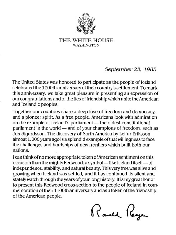 Í lok árs 1983 skrifar Náttúrufræðistofnun forsætisráðuneytinu og spyrst fyrir um afdrif þjóðargjafarinnar. Utanríkisráðuneytið hafði samband við stjórnvöld í Bandaríkjunum og var þá hafist handa við að finna leið til að efna loforðið um risafurusneið. Ekki tókst að hafa upp á nothæfri risafurusneið, en málið var leyst með því að taka sneið úr 1.300 ára gömlum rauðvið (Sequoia sempervirens) úr landi Skógastofnunar Bandaríkjanna norðan Klamathár í Kaliforníu. Sneiðin var flutt til Íslands og meðhöndluð eftir kúnstarinnar reglum. Í nóvember 1985 afhenti Nicholas Ruewe þáverandi sendiherra Bandaríkjanna á Íslandi Steingrími Hermannssyni þáverandi forsætisráðherra gjöfina frá 1974 í Háskólabíói þar sem hún skyldi vera til sýnis. Þegar gjöfin var afhent las Ruewe sendiherra upp ávarp frá Ronald Reagan forseta Bandaríkjanna. Við sama tækifæri afhenti Steingrímur Náttúrufræðistofnun Íslands sneiðina til varðveislu.
