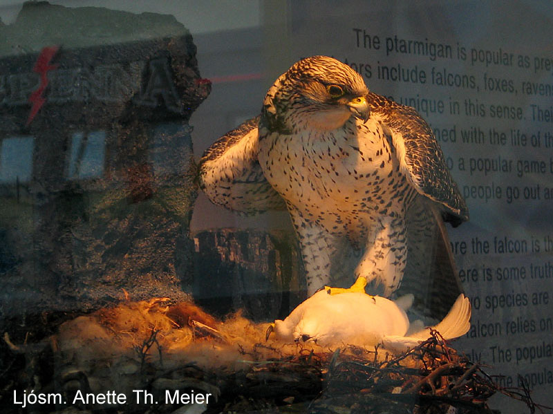 Fálki með rjúpu í hreiðri sínu. Ljósm. Anette Th. Meier.