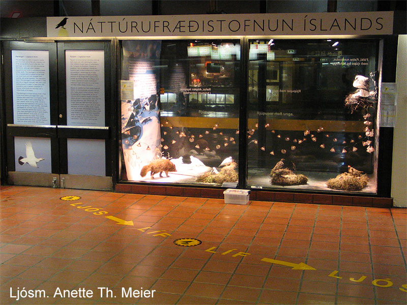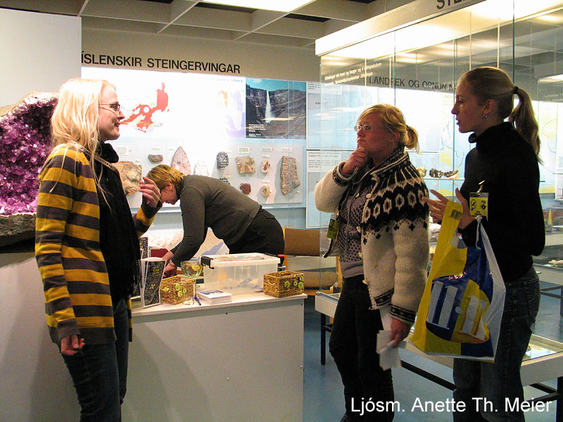 | Áhugasamir safnverjar. Ljósm. Anette Th. Meier. | Húsnæði Náttúrufræðistofnunar var skreytt í bak og fyrir með auðkenni stofnunarinnar – hrafninum. Ljósm. Anette Th. Meier. |