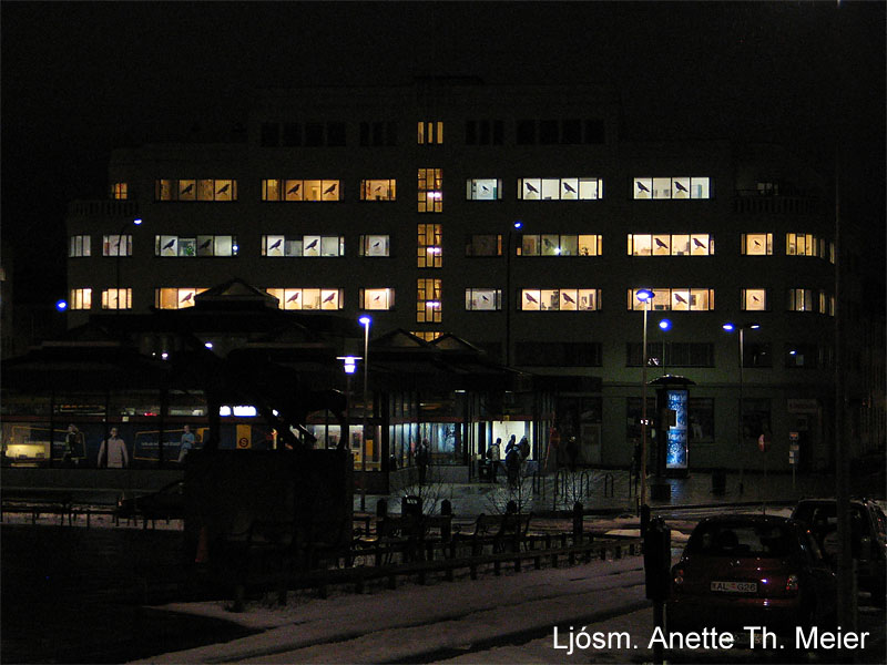 Húsnæði Náttúrufræðistofnunar að Hlemmi 3 var skreytt í tilefni Safnanætur og lýsti auðkenni stofnunarinnar – hinn mikli vísdómsfugl hrafninn – upp glugga húsnæðisins.