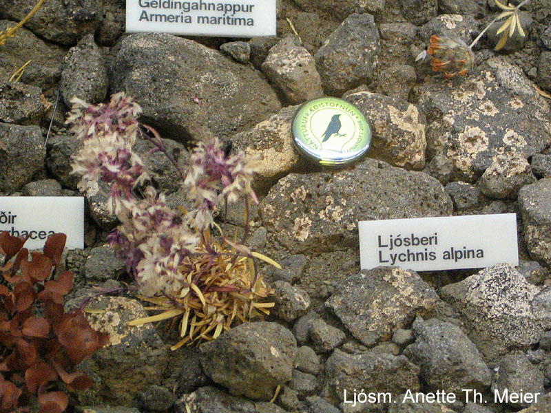 | Ljósberi, Lychnis alpina, var einnig einn þeirra gripa sem finna átti í 'myrkraboxinu'. Ljósm. Anette Th. Meier. |