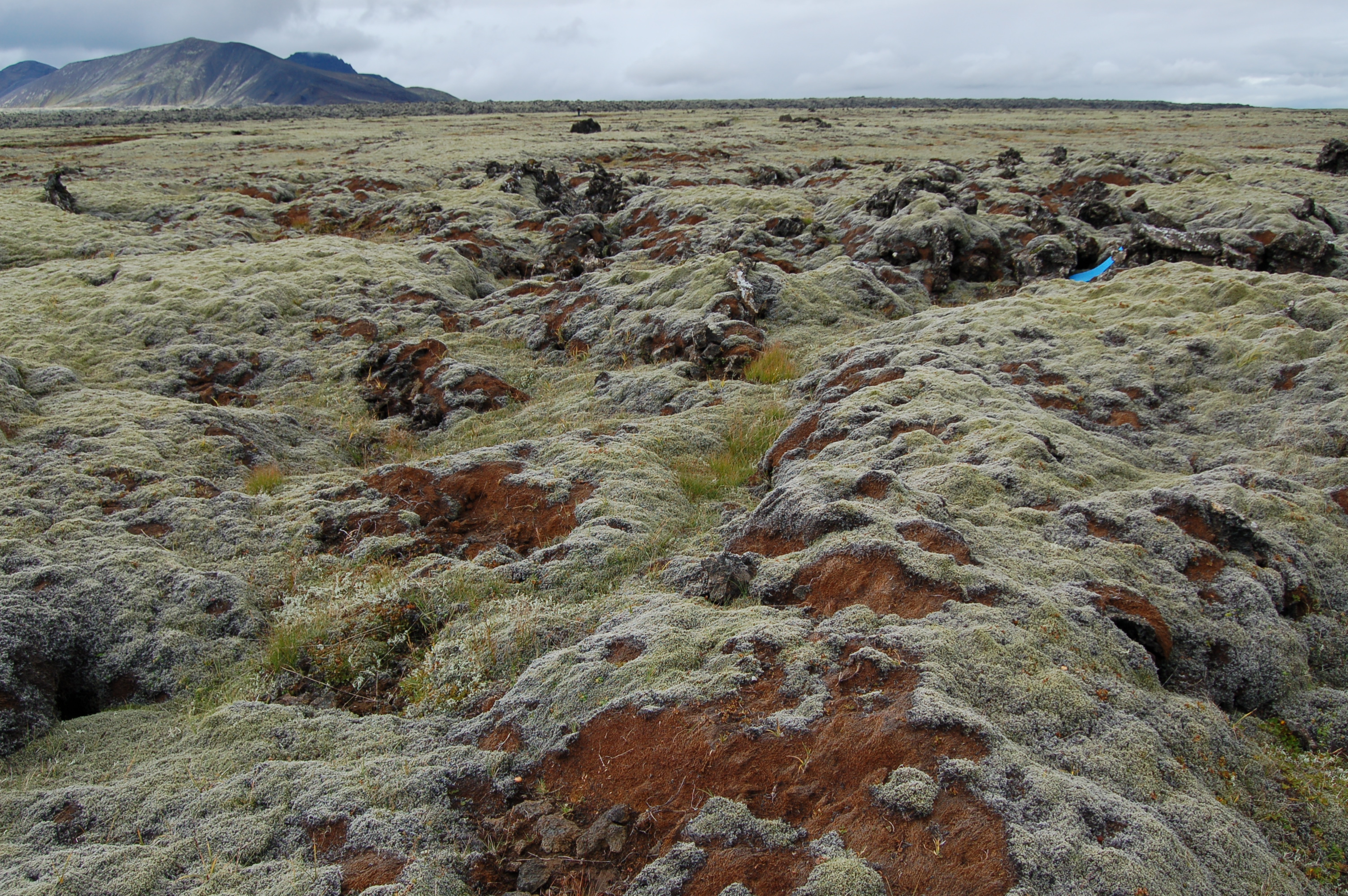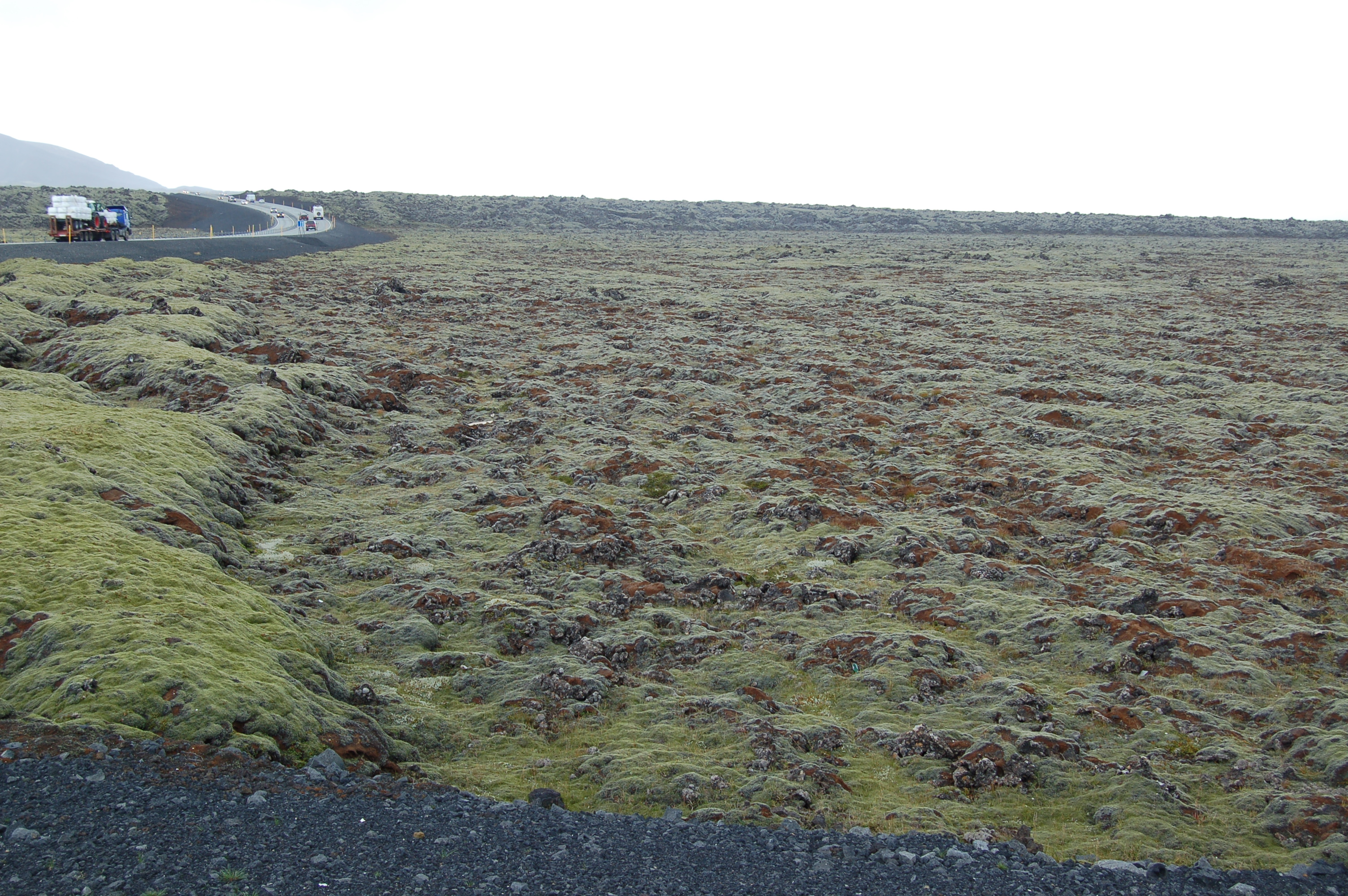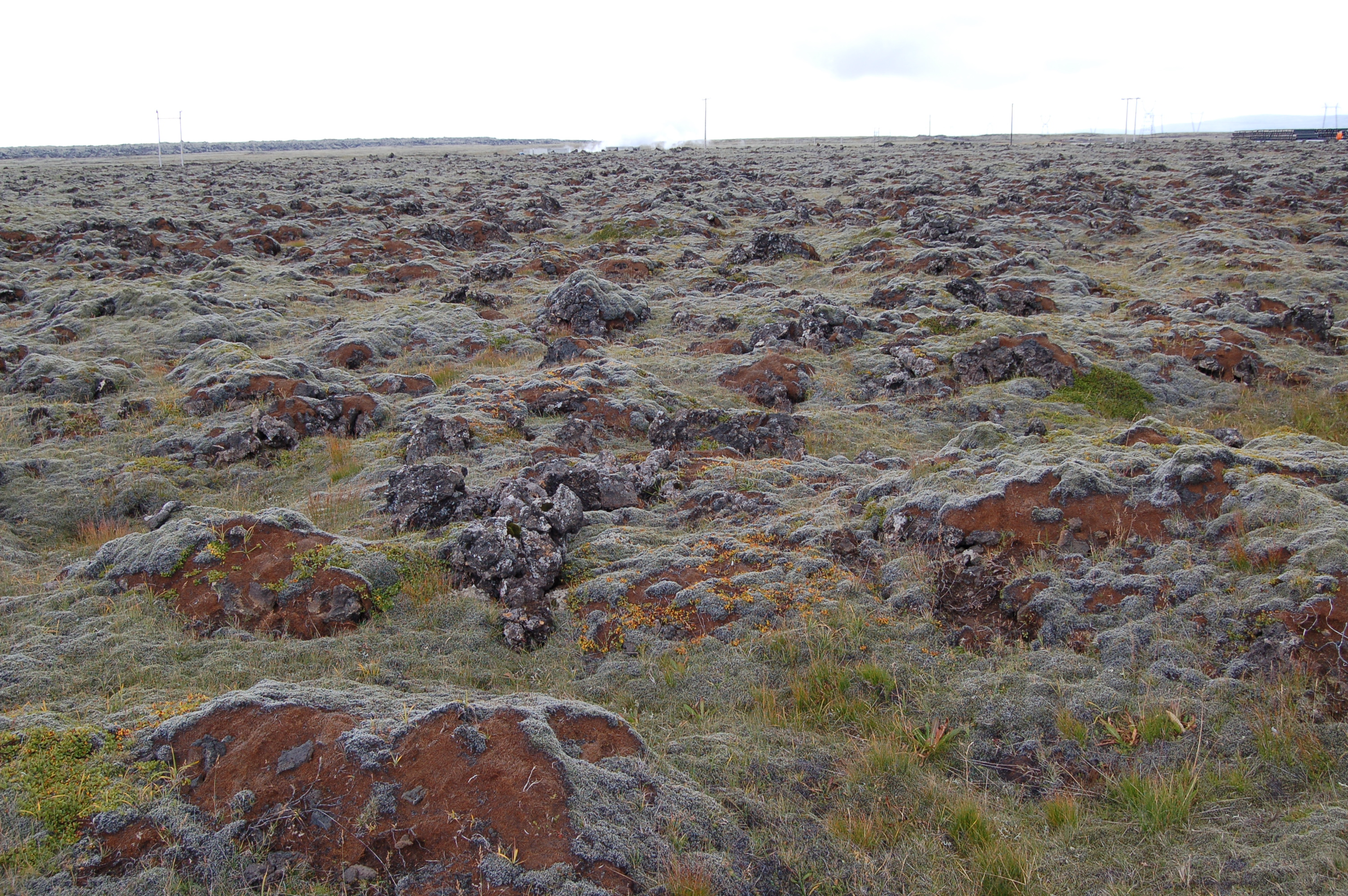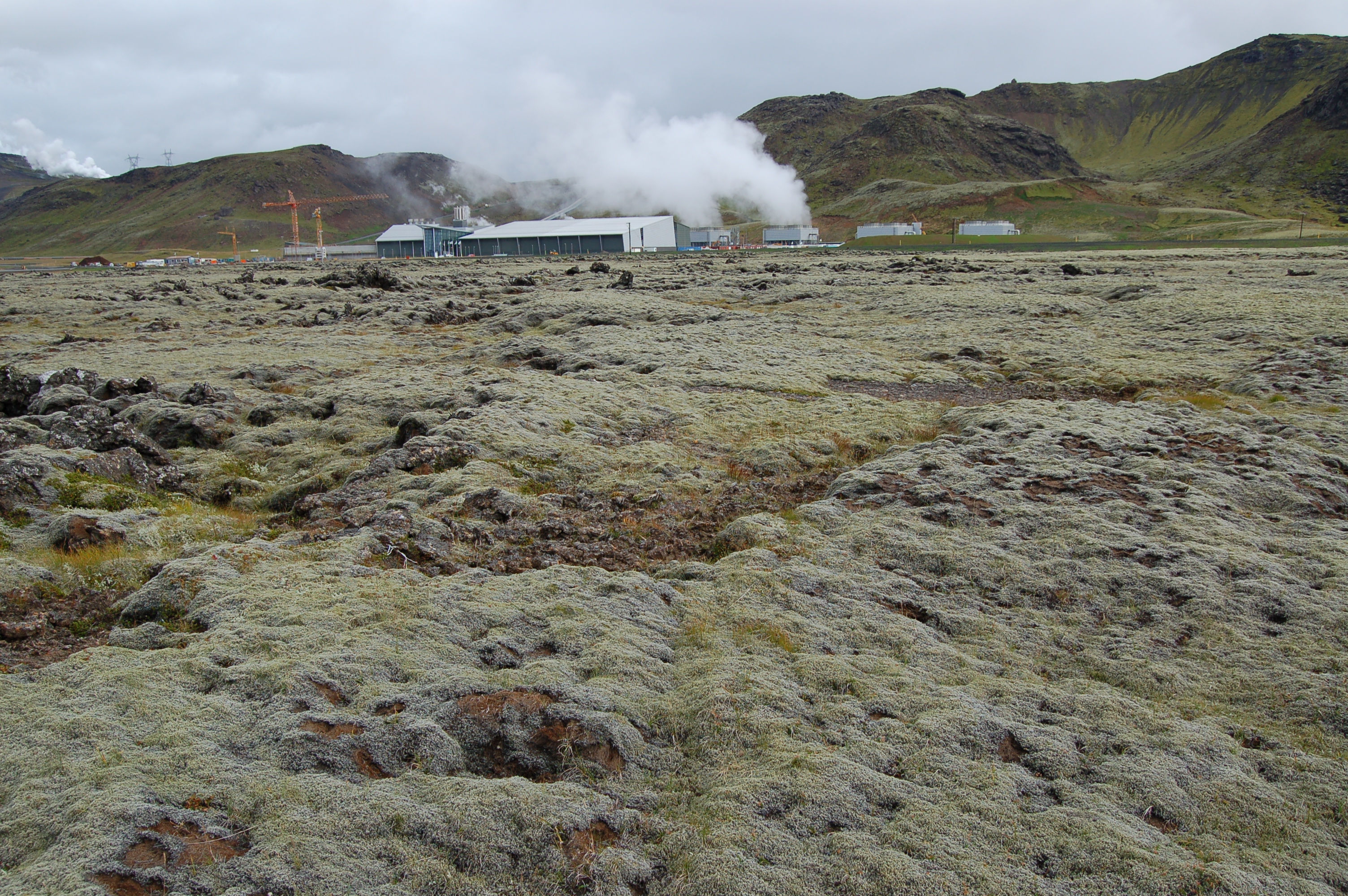| Horft til Hellisheiðarvirkjunar. Litlar skemmdir sjáanlegar. Ljósm. Sigurður H. Magnússon. | Horft frá Hellisheiðarvirkjun. Töluverðar skemmdir á mosa. Ljósm. Sigurður H. Magnússon. |