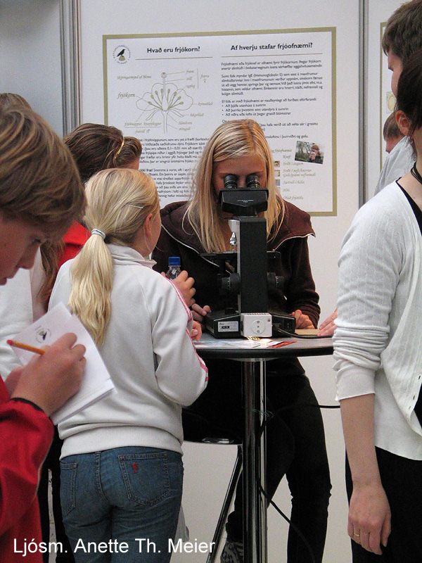 Vinsælt var að skoða frjókorn í smásjá. Ljósm. Anette Th. Meier