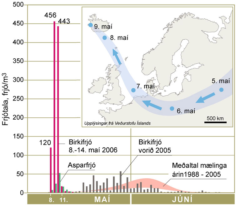Fram undan er blómgunartími íslenska birkisins, og er það víða komið með hangandi rekla á höfuðborgarsvæðinu. Þess er þá vart langt að bíða, að frjókorn dreifist út í loftið á nýjan leik. Fram til þessa hefur frjótala birkis orðið hæst 142, en það var 2. júní 1991 og svo aftur 13 árum síðar eða 23. maí 2003. Þess má geta að meðalfjöldi birkifrjóa sem að jafnaði sleppur út í loftið vor hvert hér á Reykjavíkursvæðinu er um 340 frjó í rúmmetra lofts. Spönnin er frá 26, sem mældist vorið 1989, upp í 1103 vorið 2003. Þannig að breytileikinn getur verið mikill háð því m.a. hvort veður helst þurrt á meðan birkið er í blóma, en hitastig hefur áhrif á það hversu mikið berst út í loftið.