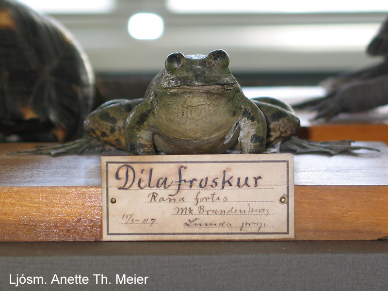 Á sýningunni er að finna fjöldann allan af gripum úr sögu safnsins, m.a. þennan dílafrosk. Ljósm. Anette Th. Meier.