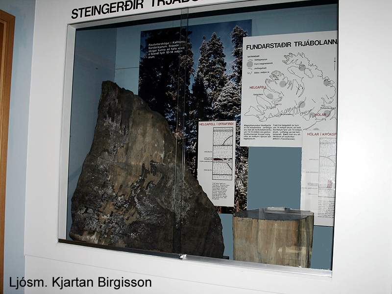 Í Náttúrugripasafni Náttúrufræðistofnunar var í áratugi til sýnis útflattur trjábolur, surtarbrandur, frá Helgafelli í Dýrafirði (til vinstri á myndinni). Hann er úr sömu setlagasyrpu og myndaður á sama tíma og surtarbrandurinn í Bolungarvík, eða fyrir um 15 milljón árum. Ljósm. Kjartan Birgisson.