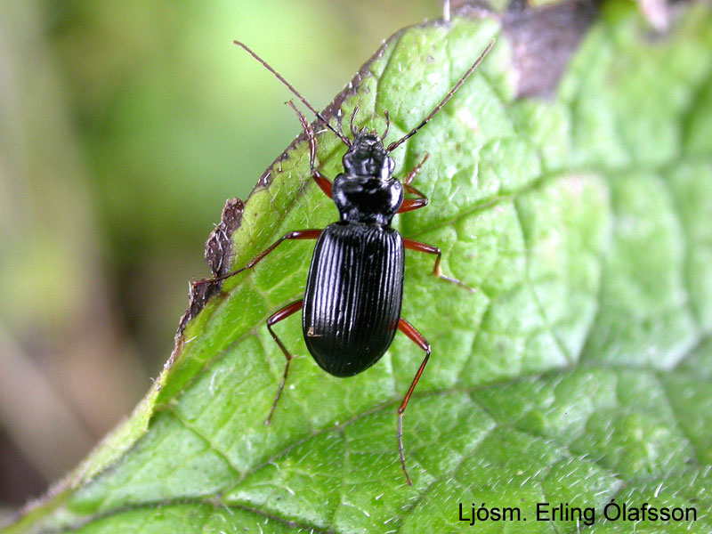 | Járnsmiður, Nebria rufescens, er mjög algengur á láglendi á Íslandi. Ljósm. Erling Ólafsson. | Lyngbobbi, Arianta arbustorum, er ein tegundanna sem fræðast má um á vef Náttúrufræðistofnunar. Ljósm. Erling Ólafsson. |