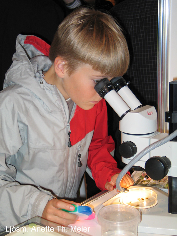 Pöddur skoðaðar í víðsjá.