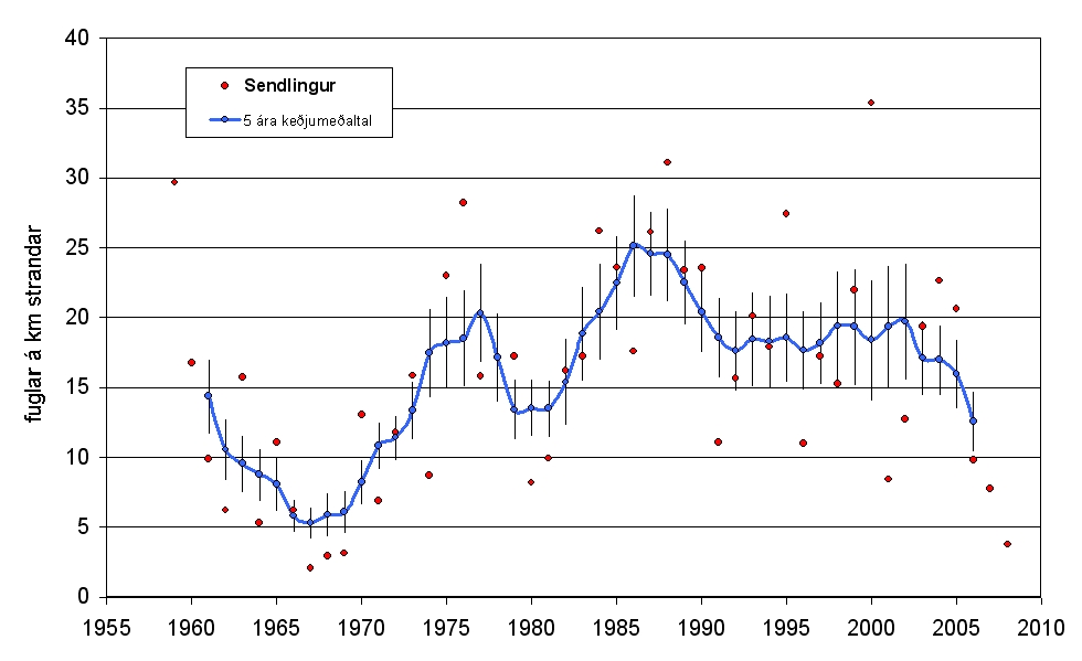 Sendlingur sveiflast mikið í fjörum Suðvesturlands og er tífaldur munur á þéttleika hans milli áranna 1967-69 annars vegar (hafísár) og 1987-88 hins vegar. Sendlingi virðist hafa fækkað mjög hratt síðustu fimm árin. Hann er útbreiddur í fjörum umhverfis landið og því verður athyglisvert að sjá vísitölur úr öðrum landshlutum.
