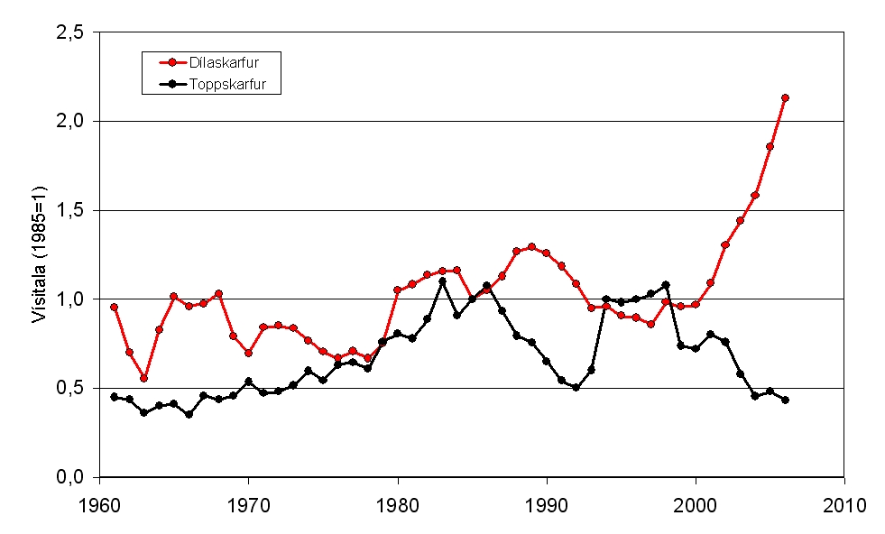 Skarfar. Miklar sveiflur virðast í stofnum dílaskarfa og toppskarfa síðustu 50 árin og eru stofnbreytingar þeirra sjaldnast í takt. Dílaskarfar hafa verið vaktaðir árlega síðan 1994 (Arnþór Garðarsson 2008, Bliki 29: 1-10). Fjöldi hreiðra í Faxaflóa og meðalfjöldi fugla/km strandar á Suðvesturlandi á árabilinu 1994-2008 sýna mjög góða fylgni. Færri heildartalningar eru til á toppskörfum (Arnþór Garðarsson & Ævar Petersen 2009, Bliki 30: 9-25). Endurteknar talningar í einstökum toppskarfsbyggðum sýna miklar svæðisbundnar breytingar. Samfelld fjölgun frá 1975 í nokkrum byggðum í Faxaflóa er ekki í góðu samræmi við fjölda vetrarfugla, sem bendir til að þeir séu komnir af mun stærra svæði. Helstu varpstöðvar toppskarfs eru við Breiðafjörð.