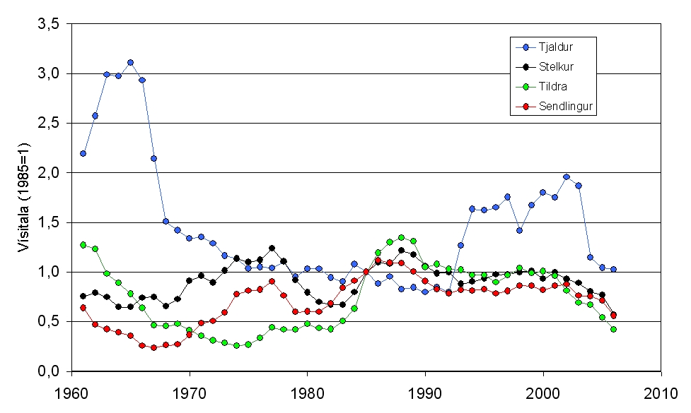 Vaðfuglar. Ólíkt sendlingi eru tjaldur, stelkur og tildra meira og minna bundin við fjörur Suðvesturlands að vetrarlagi. Ótrúlega góð fylgni er með breytingum á fjölda sendlings, stelks og tildru síðan fyrir 1985. Tjaldur sýnir á hinn bóginn allt annað mynstur. Öllum fjórum tegundunum hefur fækkað verulega (50%) síðustu sjö árin eins og vakin var athygli á í Blika 29 (Vetrarfuglatalningin 2008, bls. 62-64), en þar var vísitalan reiknuð með öðrum hætti úr gögnum frá landinu öllu.