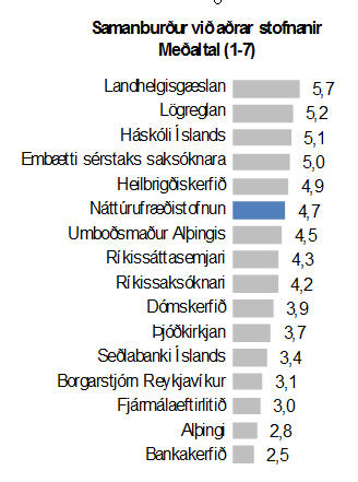 Náttúrufræðistofnun kemur vel út í samanburði við aðrar stofnanir og er vel fyrir ofan meðaltalið og er þar á róli með Heilbrigðiskerfinu og Umboðsmanni Alþingis.