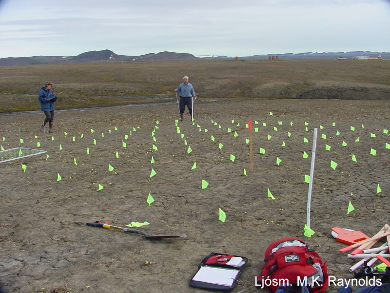 10 x 10 m permanently-marked grid set up in 2005 to characterize arctic vegetation at Isachsen, Ellef Ringnes Island, Nunavut, Canada. Photo M.K. Raynolds.