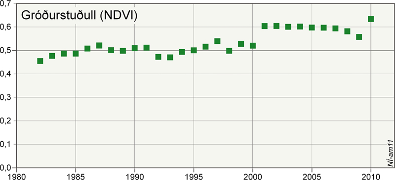 Við greininguna voru notuð gögn þar sem landinu öllu er skipt upp í 893 reiti. Hver þeirra er 154 km2 (12,4 x 12,4 km) að flatarmáli og afmarkaður af gervitunglinu. Fyrir hvert ár voru tekin hæstu gildi sumars í hverjum reit. Þegar meðaltal þessara hámarksgilda fyrir landið allt eru skoðuð (línurit) kemur í ljós nokkur aukning gróðurs frá árinu 1982 til 2000. Árið 2001 verður hins vegar mikið stökk upp á við. Hæsta meðalgildi fyrir landið mældist árið 2010 og er það tæplega 50% hærra en gildið frá árinu 1982.