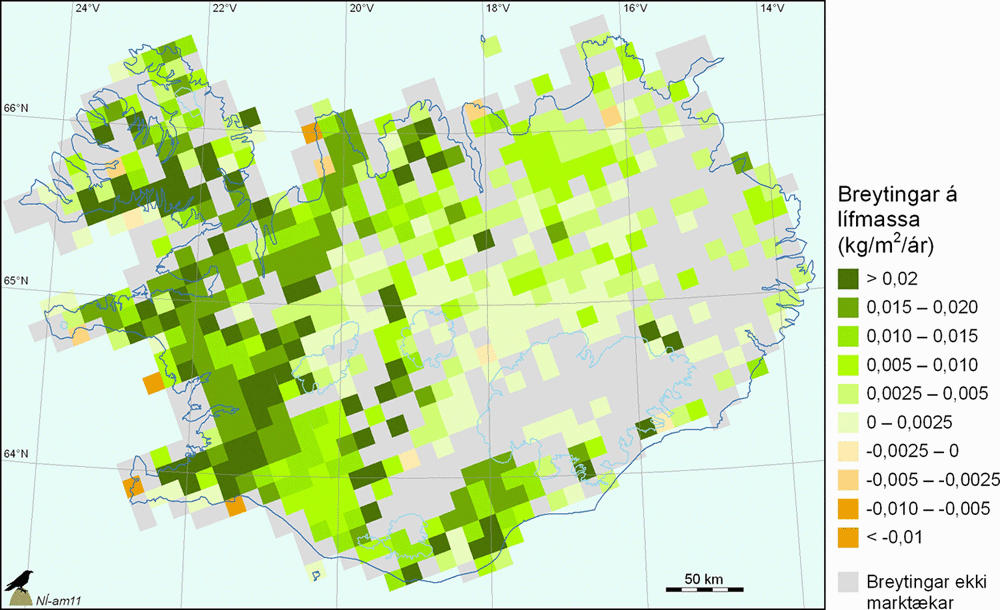 Út frá gögnunum var unnið kort af landinu sem sýnir reiknaða breytingu á lífmassa gróðurs. Þessir útreikningar byggjast á rannsóknum sem Martha K. Raynolds o.fl. hafa gert á uppskeru gróðurs á norðurslóðum og samsvörun hans við gróðurstuðulinn (NDVI). Kortið sýnir að gróðurbreytingar eru mjög ólíkar eftir landshlutum. Mestar breytingar hafa orðið á vesturhluta landsins, vestan línu sem dregin er frá austanverðum Skaga til suðvesturs um Þingvelli til Ölfuss. Minnstar breytingar hafa hinsvegar orðið á Norðausturlandi og Austurlandi. Þegar einstök svæði eru skoðuð mælist mikil aukning á sunnanverðum Vestfjörðum, talsverð á Skaga og á Húnvetnsku heiðunum. Þá hefur gróður aukist víða á Snæfellsnesi og í Dölum. Einnig ofarlega í Borgarfirði og á hálendinu vestan og suðvestan Langjökuls, t.d. á Arnarvatnsheiði og á landi vestan Þórisjökuls. Á Suðvesturlandi hefur gróður aukist mest á heiðunum suðvestur af Þingvallavatni og á norðanverðum Reykjanesskaga. Annars staðar á landinu eru allnokkur svæði bæði á hálendi og