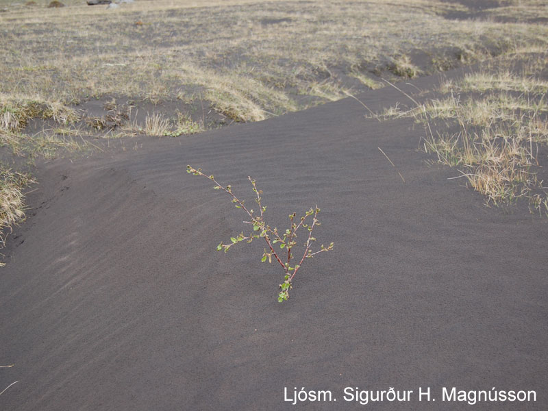 Birkihrísla í öskuskafli í skorningi austan við Lómagnúp. Ljósm. Sigurður H. Magnússon 31. maí 2011.