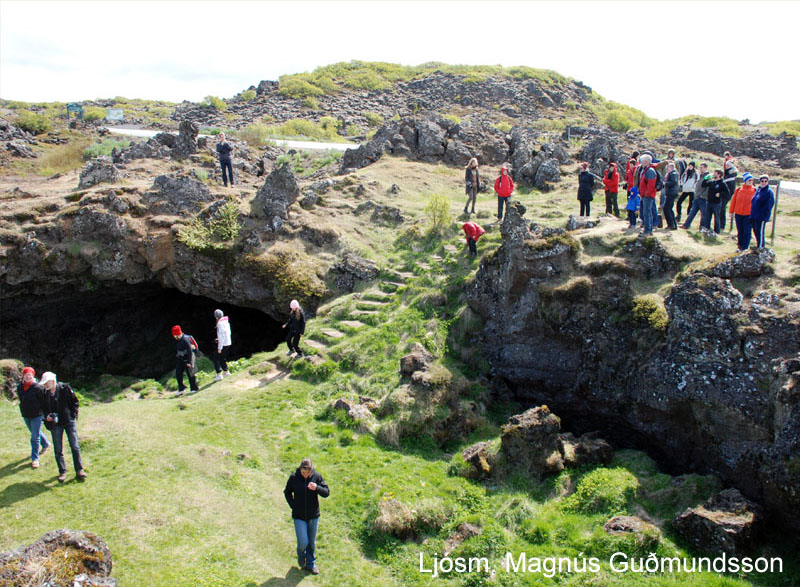 Gönguhópur við Maríuhella í Svína-hrauni. Ljósm. Magnús Guðmundsson