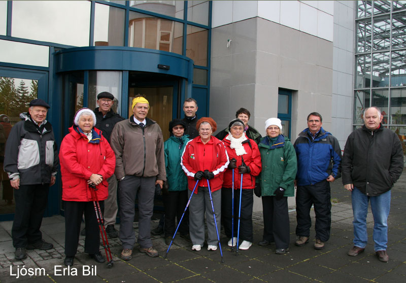 Eldri borgarar í Garðabæ ásamt bæjarstjóra og bæjarverkfræðingi leggja af stað í göngu frá Garðatorgi að húsi Náttúrufræðistofnunar Íslands. Ljósm. Erla Bil