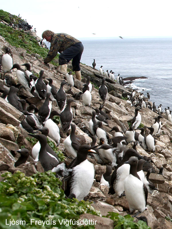 Ólafur Torfason merkir langvíuunga í Gullblettinum í Skrúð, júlí 2006. Ljósm. Freydís Vigfúsdóttir