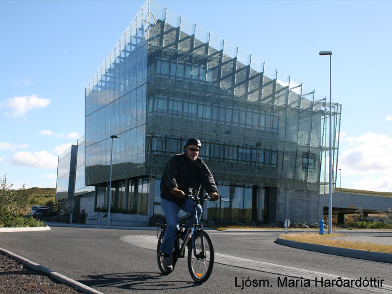 Starfsmaður Náttúrufræðistofnunar Íslands hjólar frá vinnustað sínum í Urriðaholti.