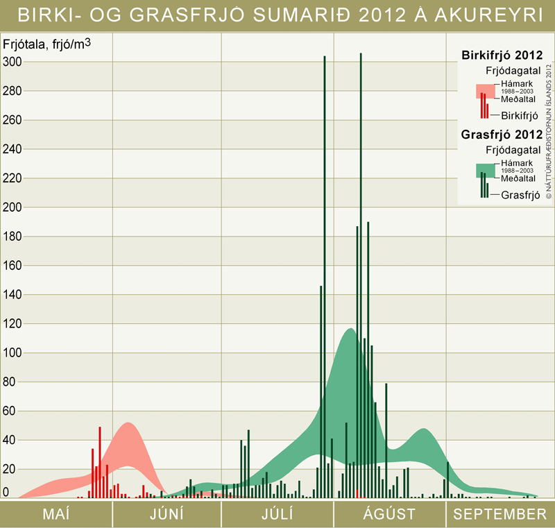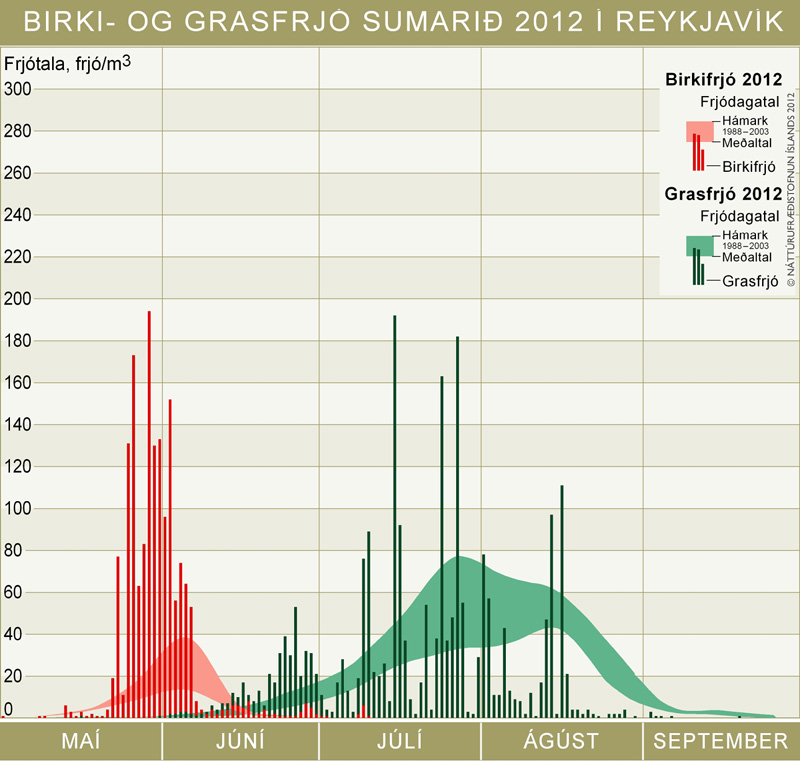 Í samantekt á vef Náttúrufræðistofnunar má lesa nánar um niðurstöður frjómælinga 2012 og skoða myndrit sem sýnir hvernig heildarfrjómagn breytist frá ári til árs í Reykjavík á árunum 1988-2012, í Garðabæ 2011-2012 og á Akureyri 1998-2012. Einnig eru sett fram frjódagatöl 2012 fyrir birki- og grasfrjó í Reykjavík og á Akureyri. Einnig má nálgast ársyfirlit og fréttatilkynningar fyrir einstaka mánuði sem pdf-skjöl.