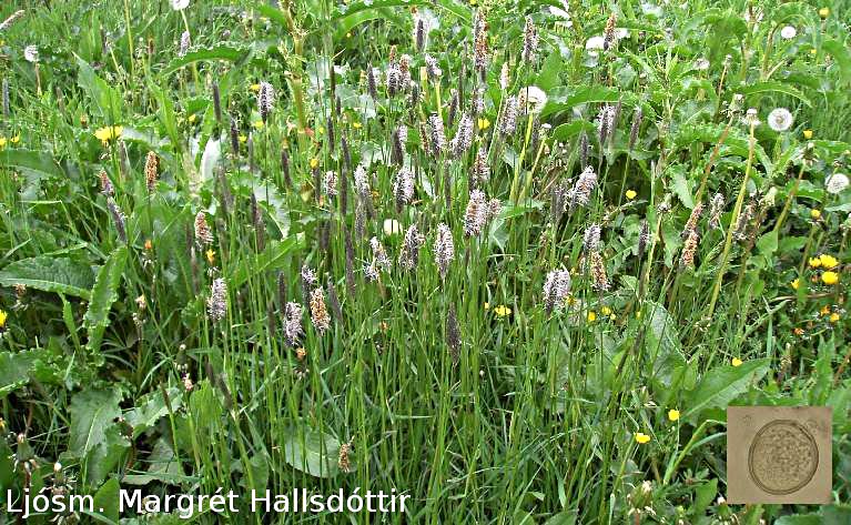Sumarið 2012 mældist mikið af grasfrjóum á öllum mælistöðum. Myndin sýnir háliðagras í blóma en grasfrjó er á innfelldu myndinni. Ljósm. Margrét Hallsdóttir.