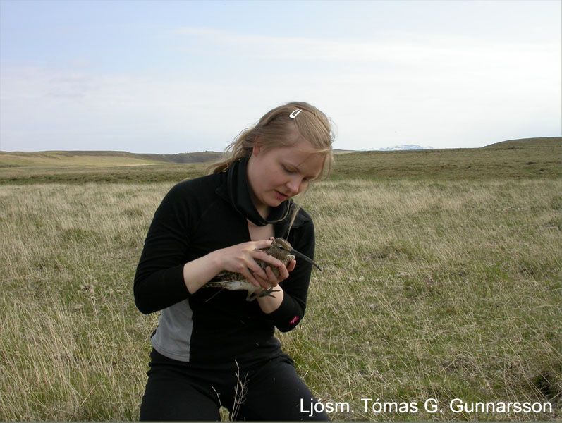 Borgný Katrínardóttir við spóarannsóknir. Ljósm. Tómas G. Gunnarsson.