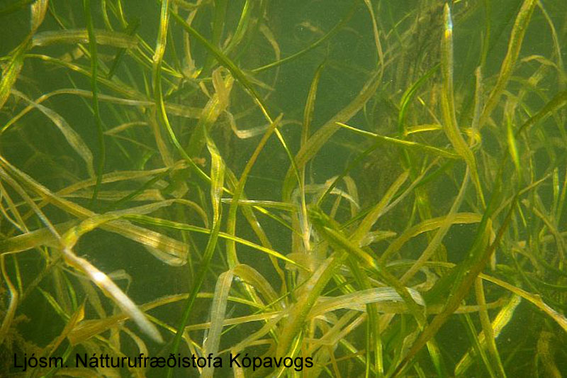 Sverðnykra, Potamogeton compressus. Myndin er tekin neðanvatns af sverðnykrubreiðu. Blöðin eru á bilinu 10-20 cm löng. Ljósm. Náttúrufræðistofa Kópavogs.