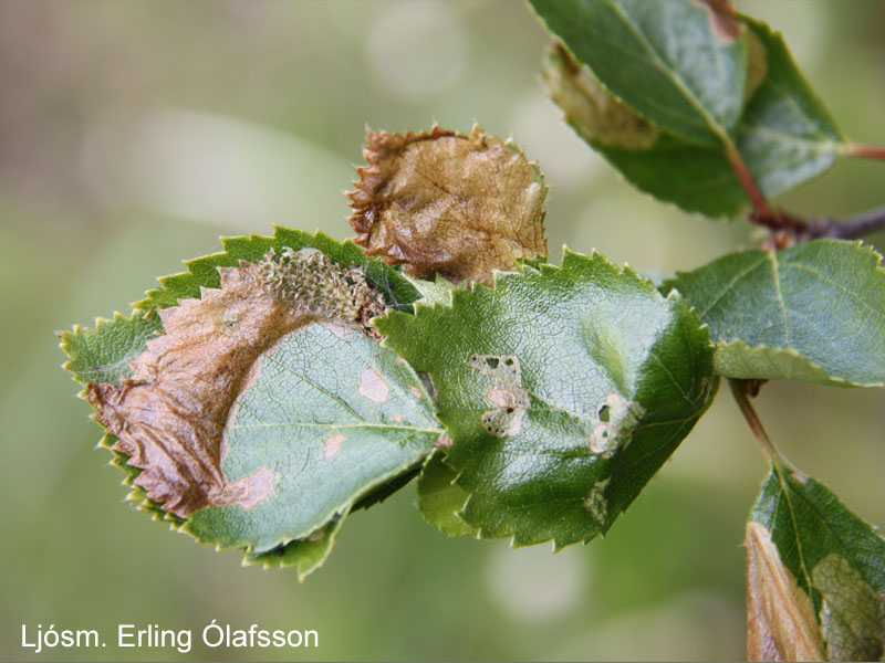 Lauf birkitrés með einkennandi ummerkjum eftir lirfur birkikembu. Mógilsá í Kollafirði 11. júní 2012. Ljósm. Erling Ólafsson.