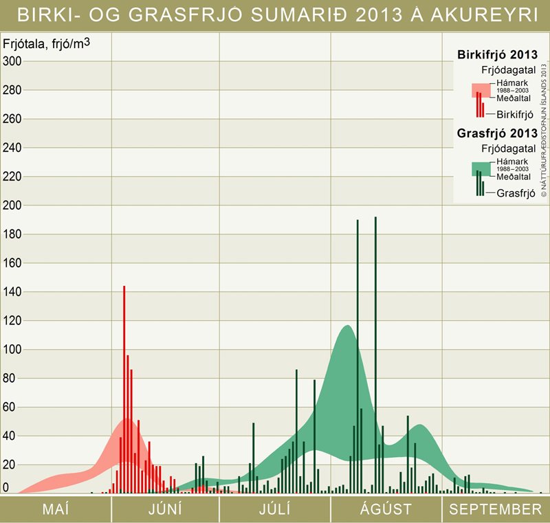 Í samantekt má lesa nánar um niðurstöður frjómælinga 2013. Þar má einnig skoða myndrit sem sýnir hvernig heildarfrjómagn breytist frá ári til árs í Reykjavík á árunum 1988-2013, í Garðabæ 2011-2013 og á Akureyri 1998-2013. Einnig eru sett fram frjódagatöl 2013 fyrir birki- og grasfrjó í Reykjavík,Garðabæ og á Akureyri. Einnig má nálgast ársyfirlit og fréttatilkynningar fyrir einstaka mánuði sem pdf-skjöl.